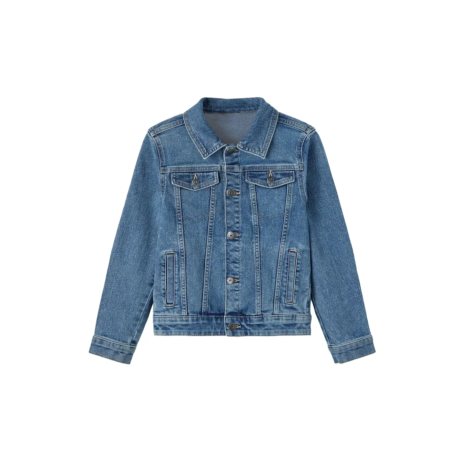 Design: Classic trucker style with button-front closure