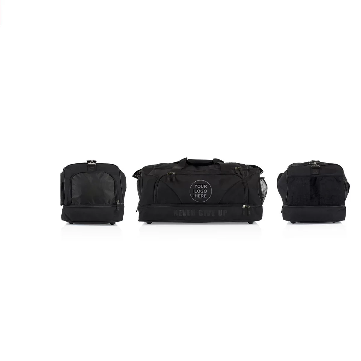 Wet cloth compartment underneath. Large shoe or boxing glove compartment at one end and 2 mesh pockets at the other for a water bottle or other belongings.